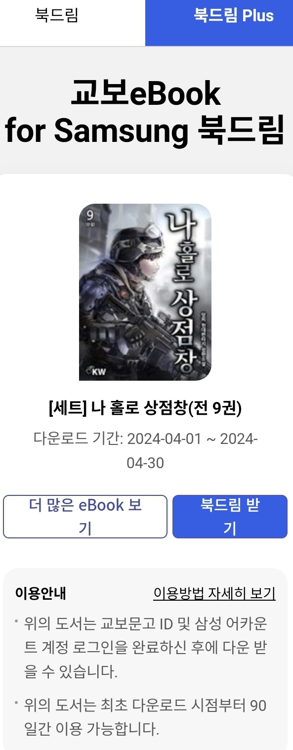 교보ebook for samsung 앱을 삼성전자 갤럭시 스토어에서 다운받아 깔고 열면 그달의 북드림도서, 북드림플러스도서가 팝업으로 뜹니다. (나중에는 책장화면에서 우상단 구석 아이콘 중 하나를 누르면 그 화면이 나옵니다)1