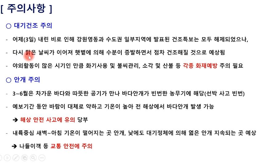 이후 건조한 날씨. 산불 조심. 안개도 많을 듯.