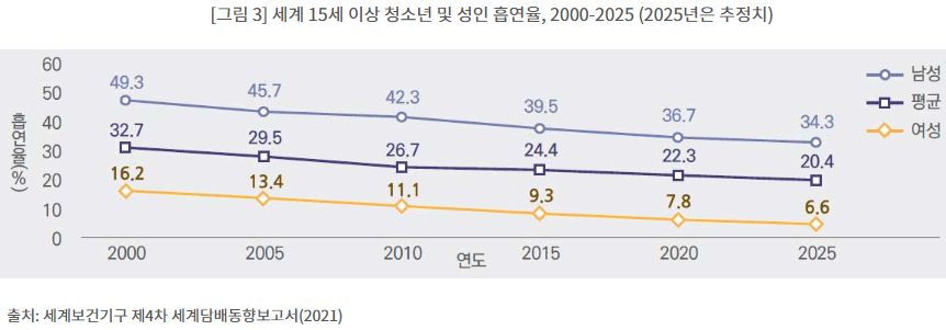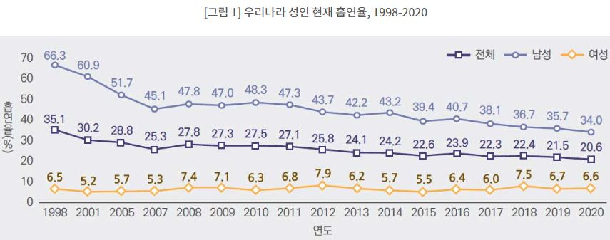 만 19세 이상 성인에서 2020년 20.6%(남성 34.0%, 여성 6.6%)임