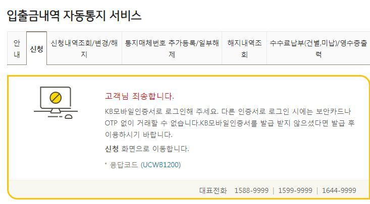 하다못해 입출금내역 SMS통지 신청같은 것도, 본인전화 인증문자라든가 창구에서 등록한 본인명의 전화기면 되는 게 아니라, KB모바일인증서가 필요합니다. 무조건 앱을 깔라는 것.