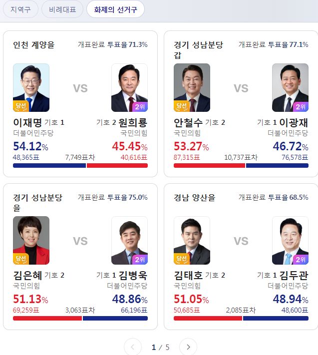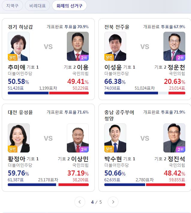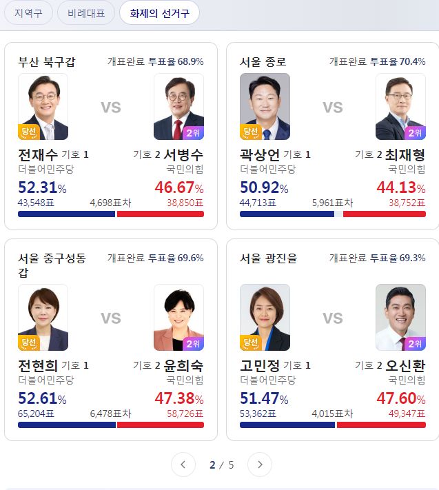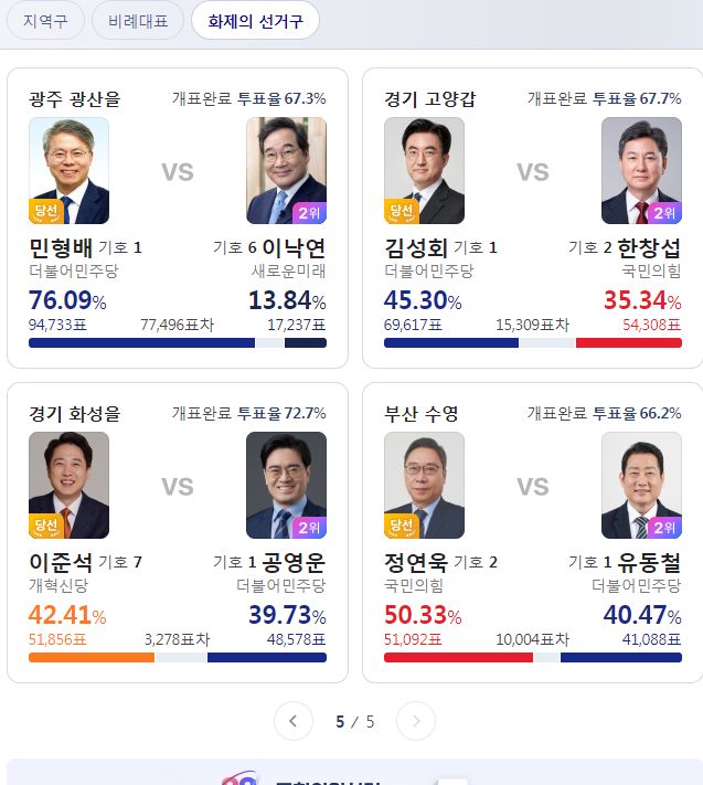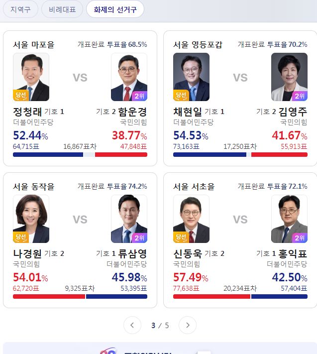 지역구투표는 개표율이 80%를 넘어서, 글쓰고 나서 F5 눌러보니 순위가 바뀌었는지 숫자가 달라져있네요.