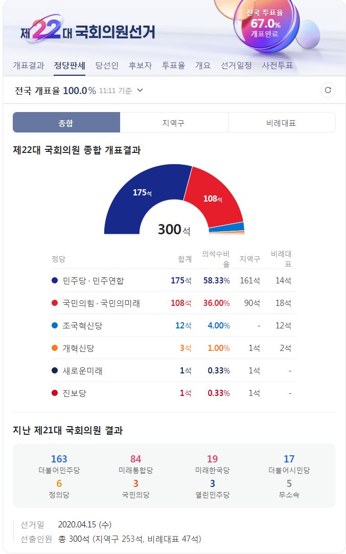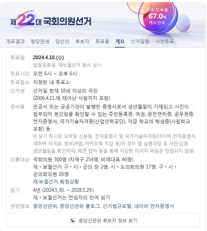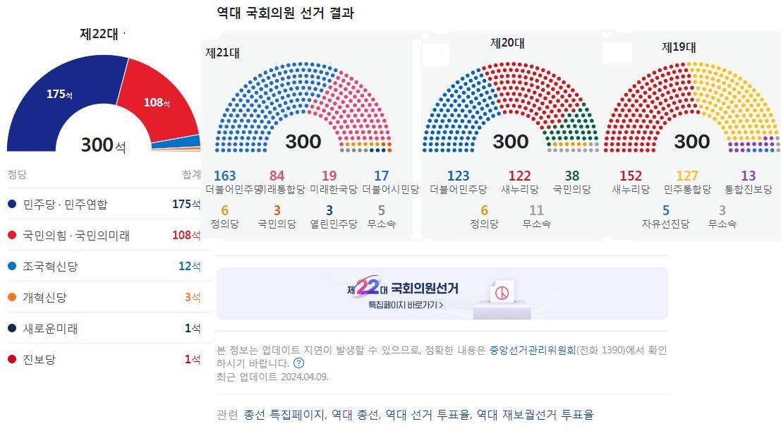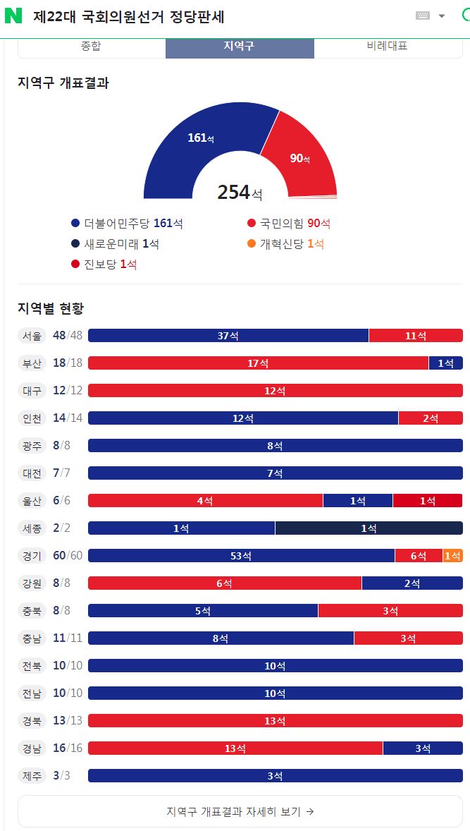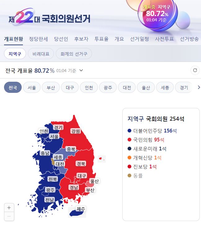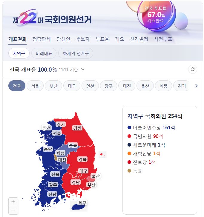 제22대 국회의원선거 전국 개표현황, 개표완료 후 선거정보 기록 (네이버) 본문
