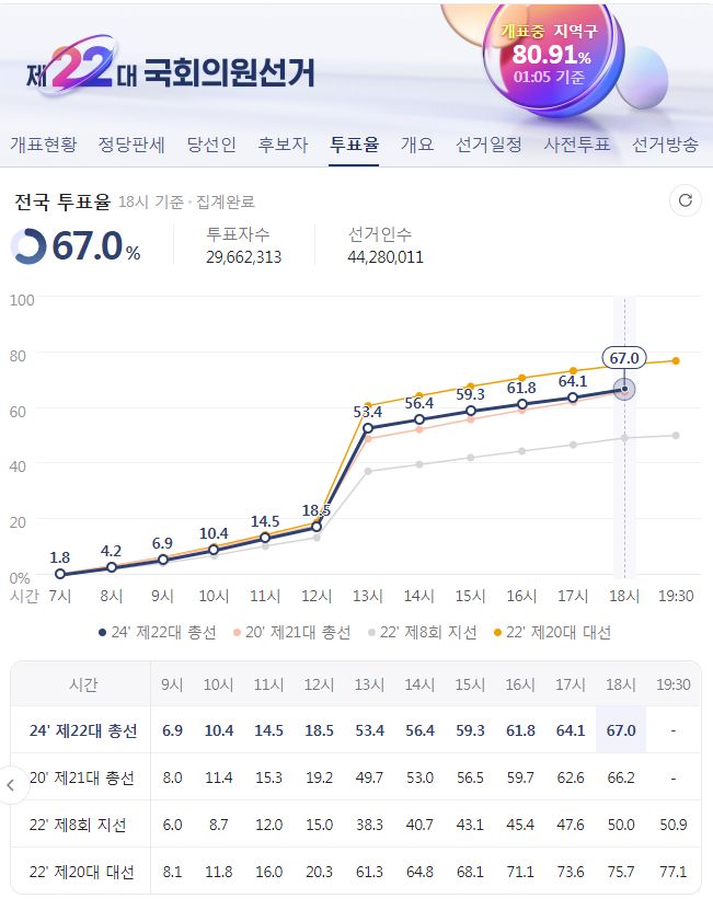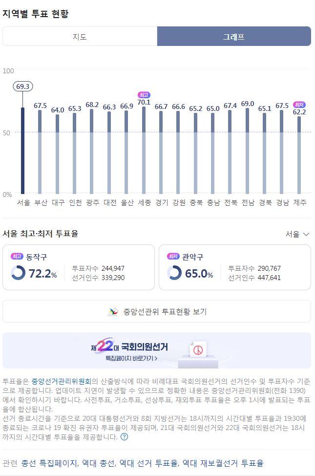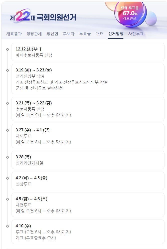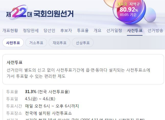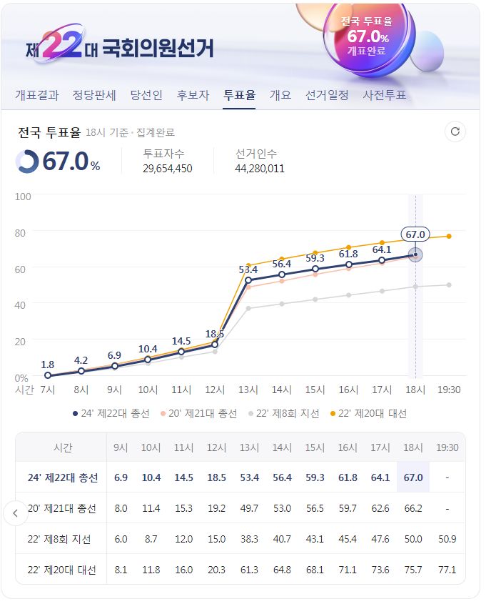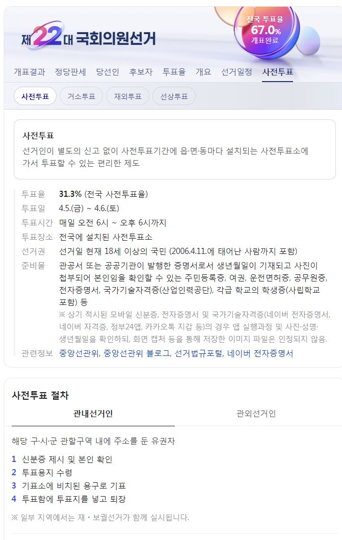 제22대 국회의원선거 전국 개표현황, 개표완료 후 선거정보 기록 (네이버) 본문