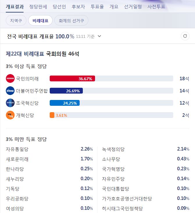 비례대표쪽은 개표율이 아직 30%도 안 됩니다. 투표용지가 너무 길어서 수개표한다고 했더랬죠.