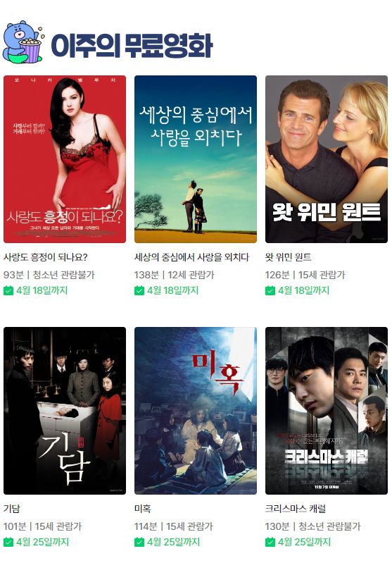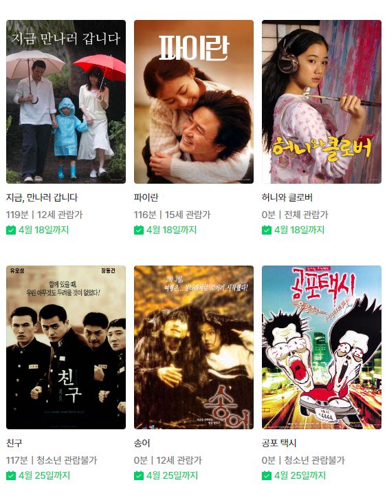| (네이버시리즈온 무료영화) 배틀로얄 1/2, 세상의 중심에서 사랑을 외치다, 지금 만나러 갑니다, 허니와 클로버 등 (0) | 2024.04.05 |