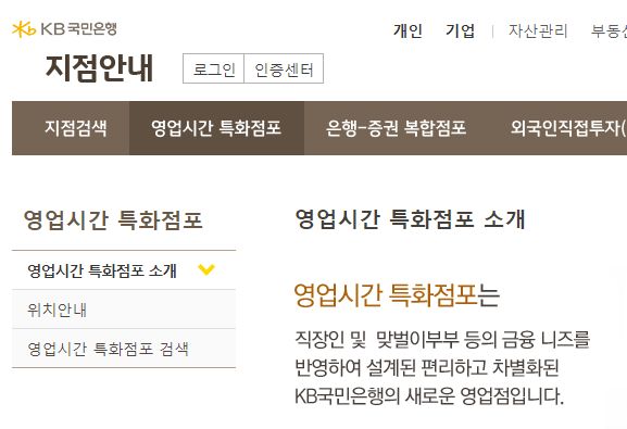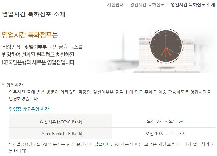 KB국민은행 영업시간 특화점포 (영업시간 연장점포): 여섯시은행(9to6 Bank), After Bank(to 5 Bank) 본문