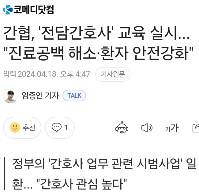 대한간호협회(간협)가 '(가칭)전담간호사 교육'을 시작했다. 이는 보건복지부가 의사 집단행동 장기화로 인한 의료공백에 대응하기 위해 실시한 '간호사 업무 관련 시범사업'의 일환이다. 전담