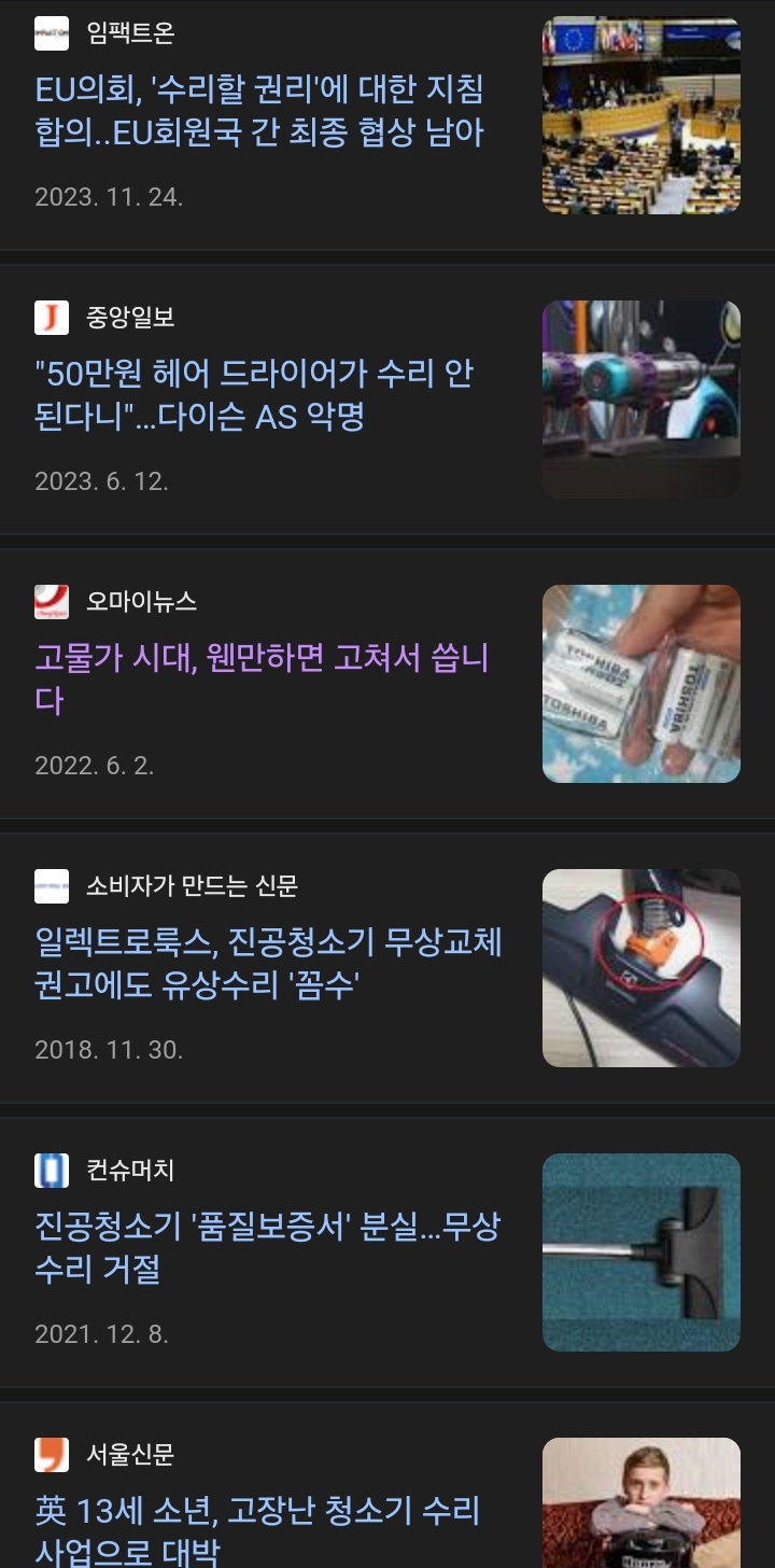 요즘도 뭐.. 고가청소기 수명과 서비스문제는 그 이후로도 진행 중인 듯. 5년 전(2019년)에는 ㄷㅇㅅ 청소기가 고장이 잘 난다며 미국 컨슈머리포트가 발표하니까 국내매체들이 미투기사를 쏟아냈군요. 기사가 검색됩니다.
