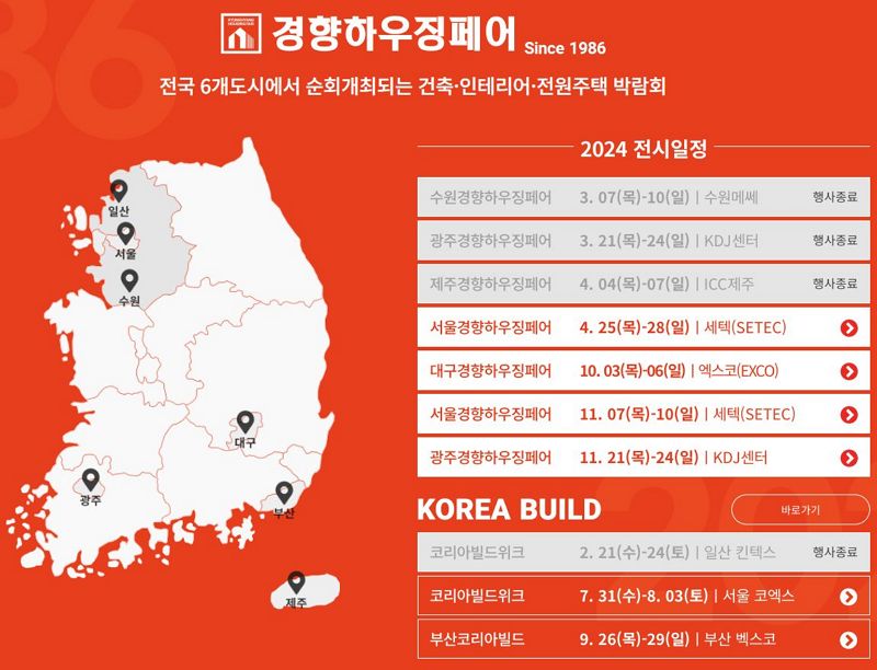집에 대한 모든 고민을 해결하는 건축박람회 경향하우징페어 : 서울, 수원, 대구, 광주, 제주에서 만나보세요! Since 1986 / 전원주택, 리모델링, 인테리어, 건축자재 등 건축 관련 전 품목 / 사전등