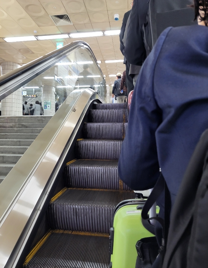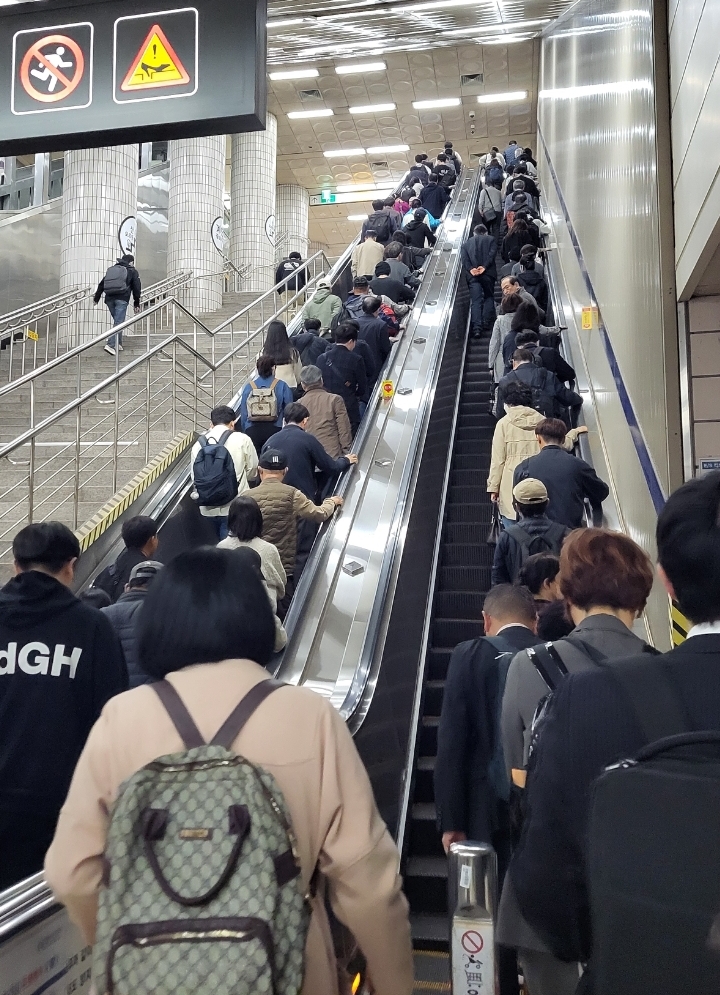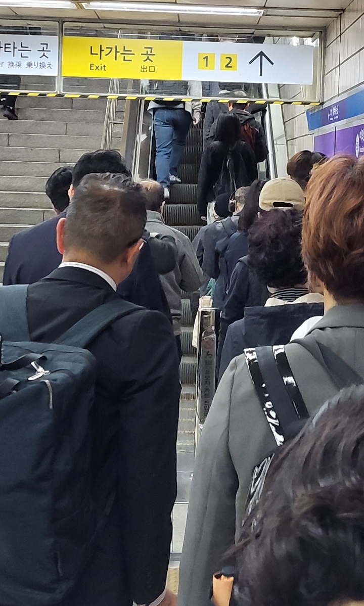 에스컬레이터앞에 길게 줄서면서도 한 줄로만 서고 옆을 비우는 사람들 본문