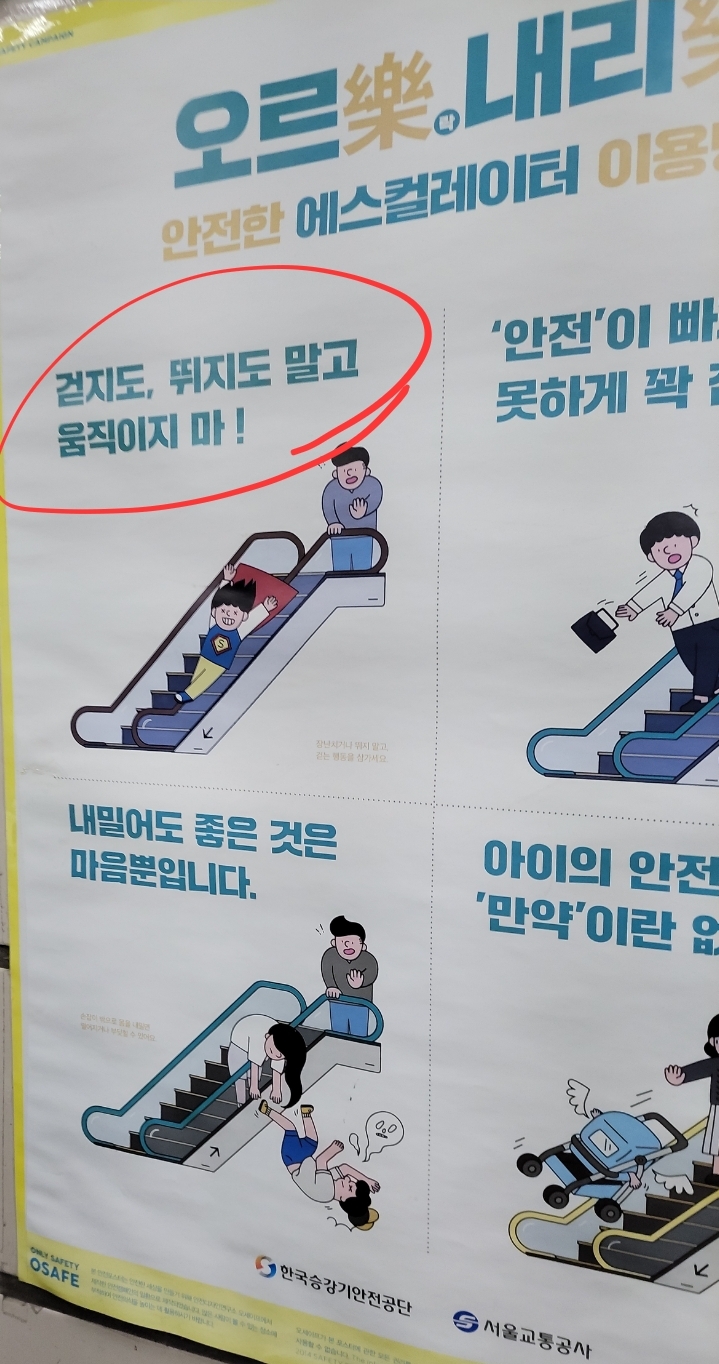 전철역에 따라서는 "걷지 말라"는 말이 나오는 저 포스터는 모르겠고, "뛰지 말라"는 안내문은 붙은 곳도 있기는 합니다만..