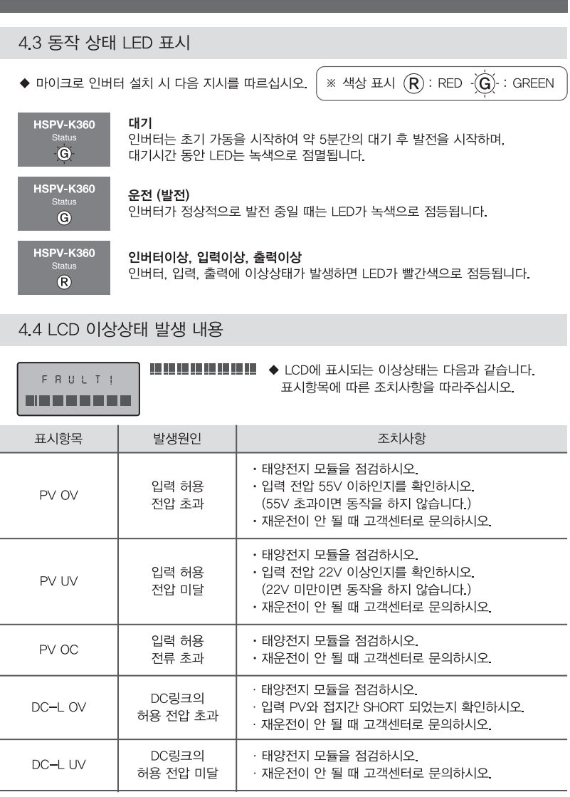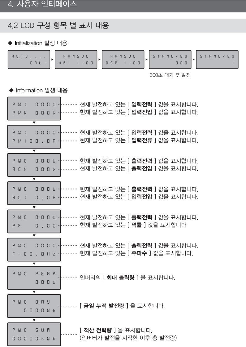 HSPV-K360 마이크로 인버터의 사용자 인터페이스: 화면 표시내용