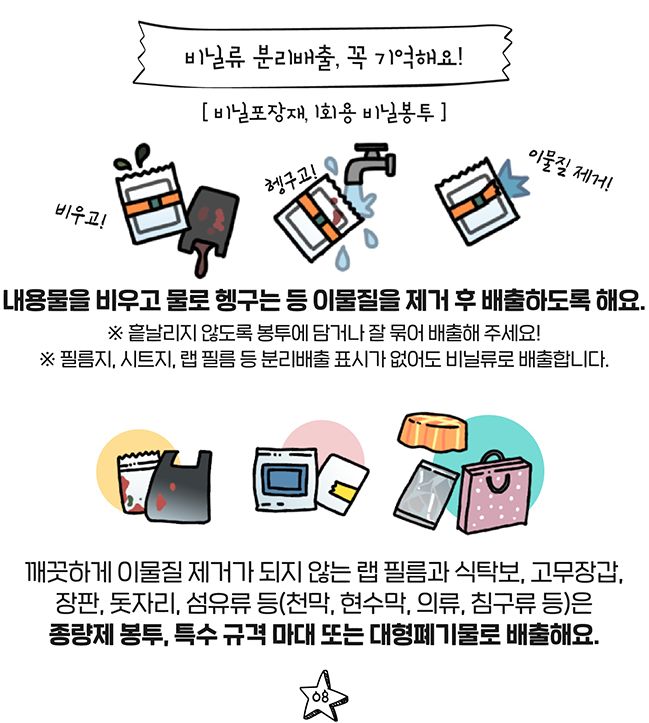 비닐쓰레기 분리수거하는 방법: 접지 말 것, 꼭꼭 뭉쳐서 안 풀리게 우겨넣지 말 것, 오염있으면 종량제 본문