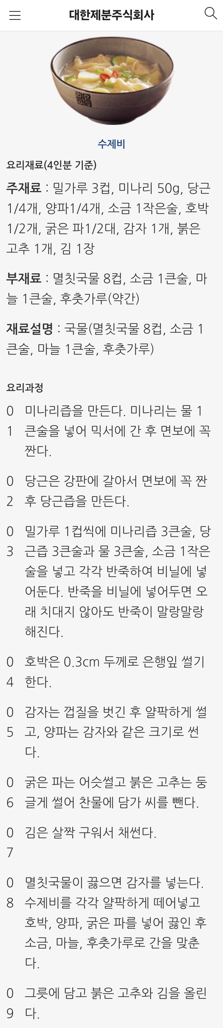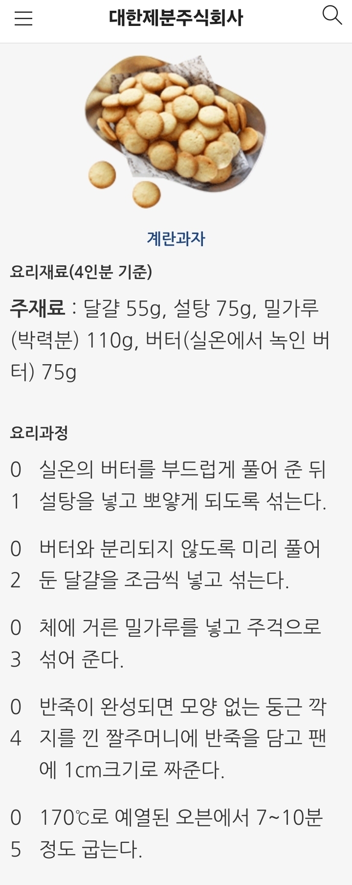 대한제분 웹사이트의 소비자용 소포장 밀가루 제품과, 칼국수, 수제비, 계란과자, 식빵레시피 본문