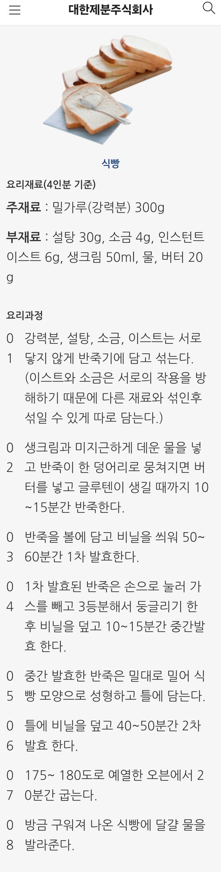 하지만 박력분을 사용한 과자반죽, 강력분을 사용한 식빵반죽은 좀 달라서, 제조사 추천 재료를 보는 의미로 메모.
