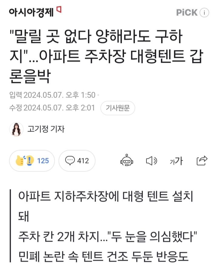 "말릴 곳 없다 양해라도 구하지"…아파트 주차장 대형텐트 갑론을박