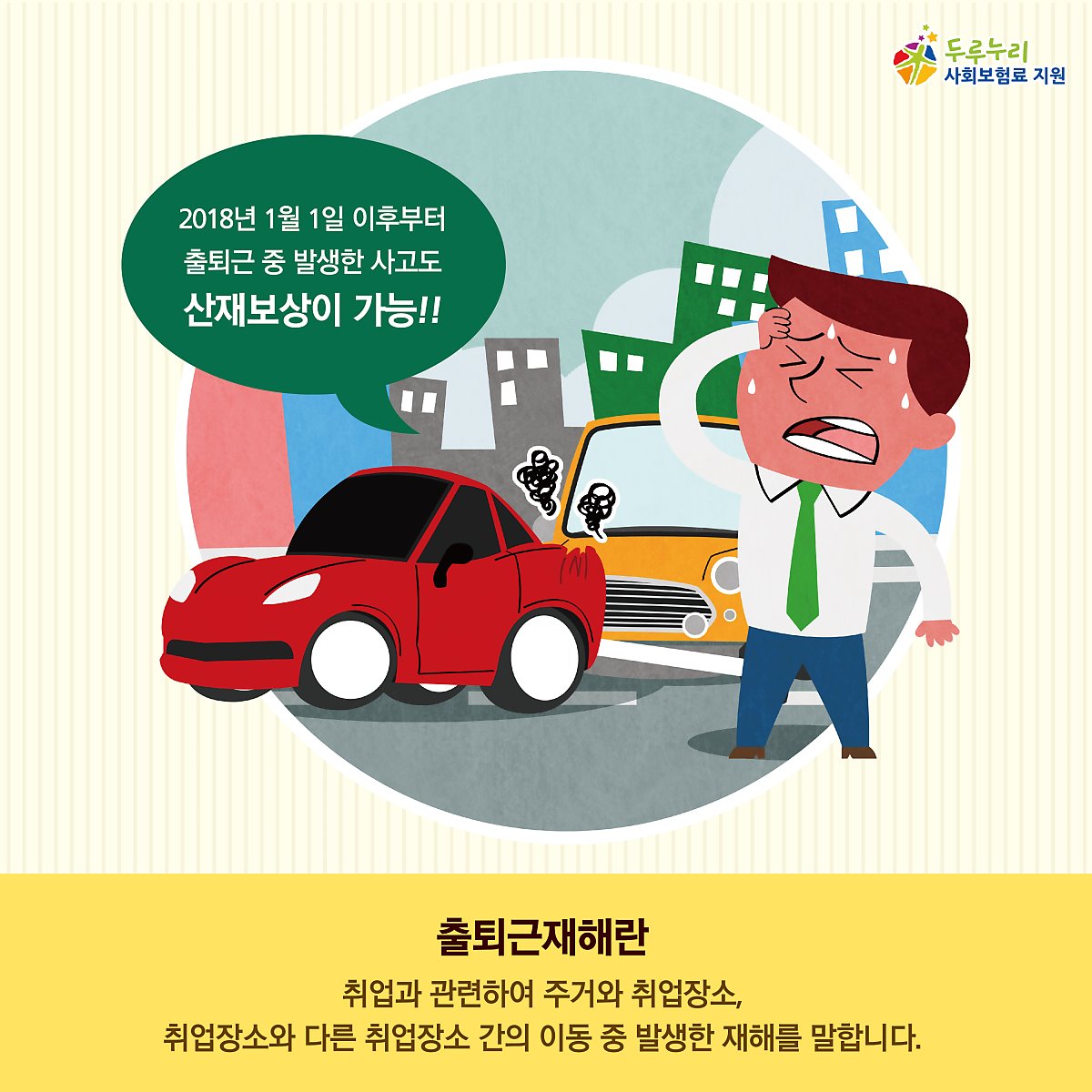 ㅡ 과거에는 통근버스 등 사업주가 출퇴근용으로 제공한 차량을 이용하던 중 발생한 사고만을 출퇴근 재해로 인정했지만 2018년 1월 산재보험법이 개정되면서 출퇴근 재해를 업무상 재해의 한 유형으로 신설, 통상적인 출퇴근 상황에서 발생한 사고까지 산재로 인정