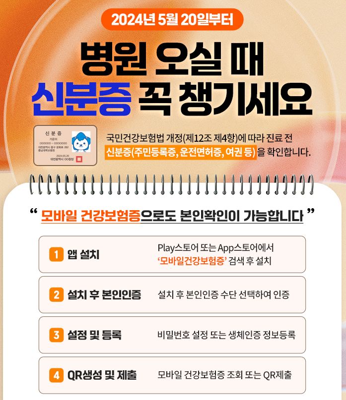 | 병의원 진료받을 때 신분증 필수! 본인확인합니다. 어제(2024.5.20.)부터 시행 중 (0) | 2024.05.21 |