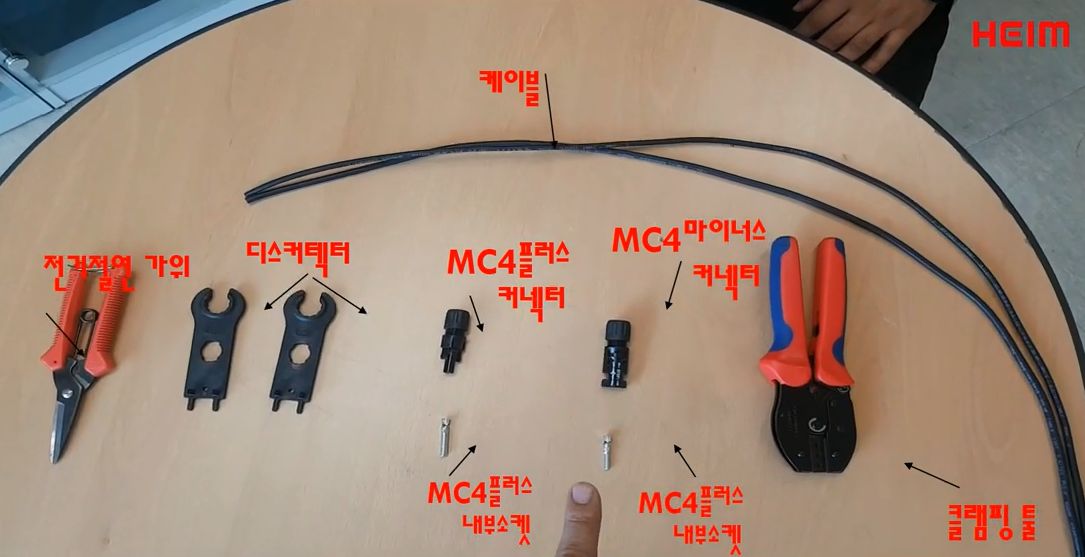 PV케이블의 피복을 벗기고 커넥터 속 금속 슬리브를 대고 압착할 때 커넥터 전용 압착기(압착툴)를 사용하기. 빠지지 않게 단단하게 꼭 물린 것을 반드시 확인. 6SQ용 케이블을 사용하므로 6SQ용 압착기를 사용.