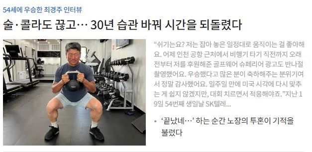 54세 골프 선수 최경주가 지난 19일 한국프로골프(KPGA) 투어 SK텔레콤오픈에서 20,30대 선수들을 제치고 극적인 연장 우승을 차지했다. 그는 바로 다음 날 미국으로 건너가 23일부터 나흘간 미국 미