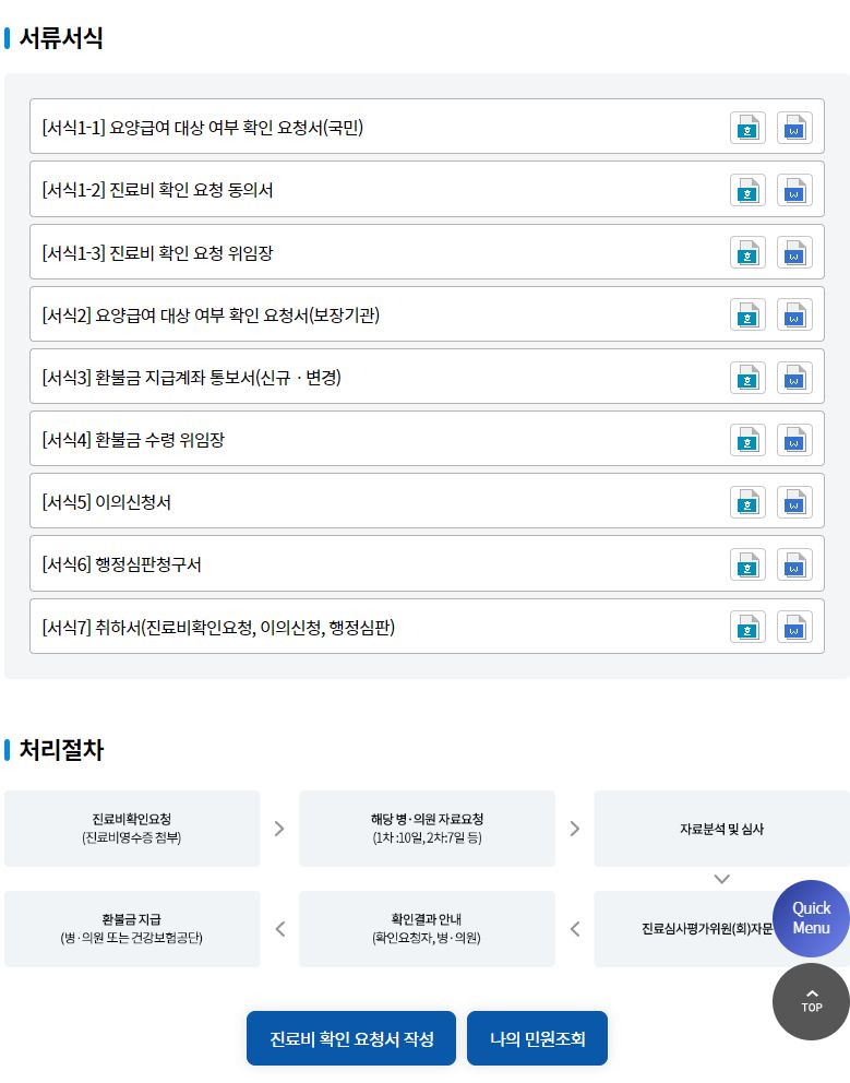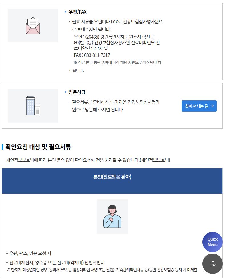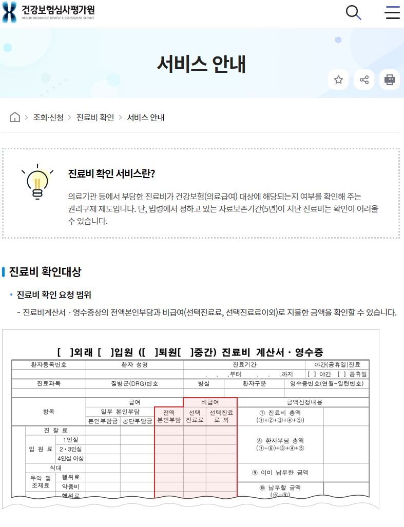 진료비 확인 서비스란? 의료기관 등에서 부담한 진료비가 건강보험(의료급여) 대상에 해당되는지 여부를 확인해 주는 권리구제 제도입니다. 단, 법령에서 정하고 있는 자료보존기간(5년)이 지난