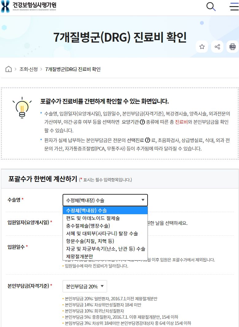 7개질병군(DRG) 진료비 확인