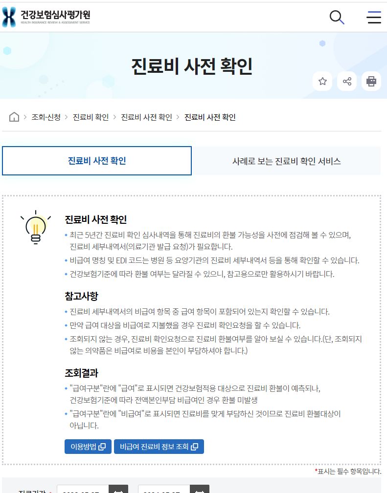 진료비 사전 확인 < 진료비 사전 확인 < 진료비 확인 < 조회·신청 < 건강보험심사평가원
