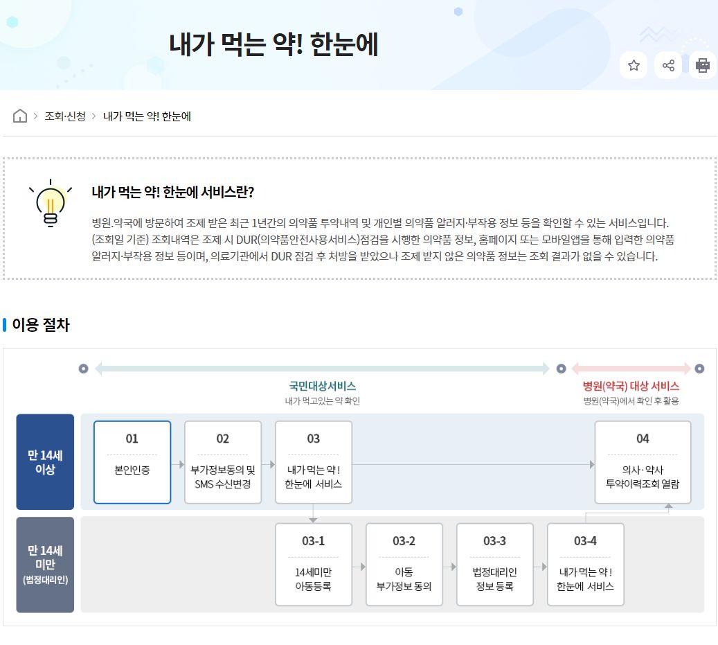 내가 먹는 약! 한눈에 서비스란? 병원.약국에 방문하여 조제 받은 최근 1년간의 의약품 투약내역 및 개인별 의약품 알러지·부작용 정보 등을 확인할 수 있는 서비스입니다.(조회일 기준) 조회내