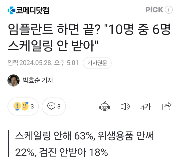"임플란트 보철물 장착 후 10명 중 6명은 스케일링을 안 받고, 10명 중 2명 정도가 치아 검진을 받지 않고, 10명 중 2명 정도가 구강위생 보조용품을 거의 사용하지 않는다는 연구 결과" - 코메디닷컴