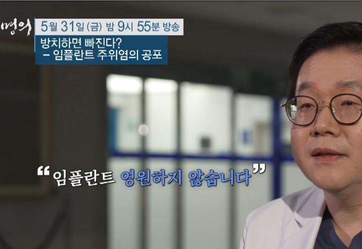EBS 명의 <방치하면 빠진다? - 공포의 임플란트 주위염>편에서는 치주과 명의 김영택 교수와 보철과 명의 윤준호 교수와 함께 임플란트 주위염의 원인과 임플란트 관리법 등을 알아본다.