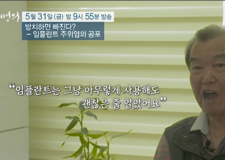 EBS 명의 <방치하면 빠진다? - 공포의 임플란트 주위염> 편에서는 치주과 명의 김영택 교수와 보철과 명의 윤준호 교수와 함께 임플란트 주위염의 원인과 임플란트 관리법 등을 명쾌하게 알아본다.