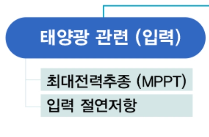 태양광 인버터의 기능은 ‘태양광 모듈 관련 기능(입력)’, ‘계통연계 관련 기능(출력)’그리고 ‘안전 관련 기능’으로 분류할 수 있다. 태양광 모듈의 출력은 일사량과 온도에 의해서 변화되므로 매 순간 최대 전력을 변환하기 위하여 MPPT(Maximum Power Point Tracking, 최대 전력 점 추종) 기능을 수행하여 최대 전력을 전력계통으로 보내는 기능을 수행한다.
