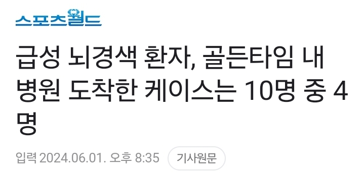 급성 뇌경색 환자, 골든타임 내 병원 도착한 케이스는 10명 중 4명. 그리고 의료접근성차이 커 (기사) 본문