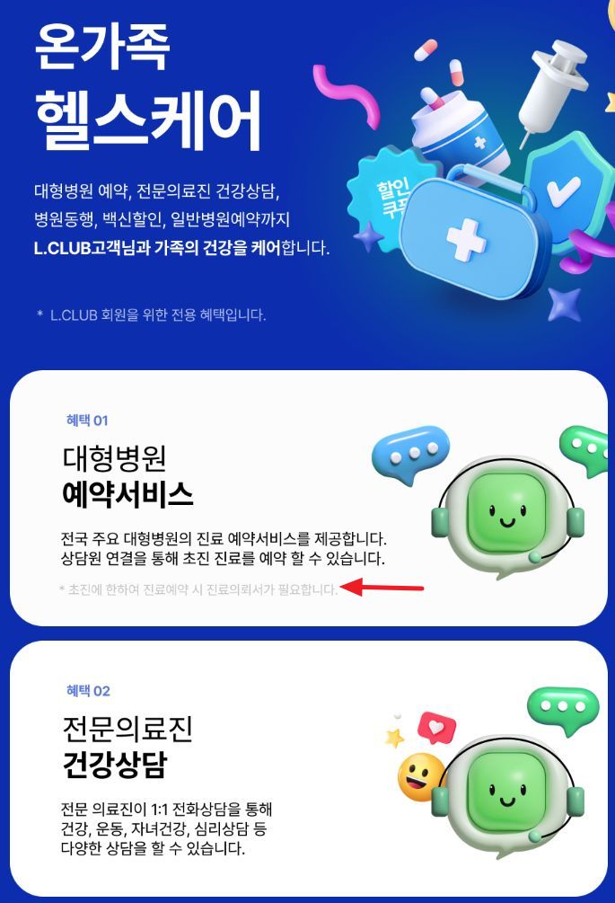 (......) 그 외 온가족 헬스케어 서비스는 △주요 백신 9종 최대 49% 할인 △일반 병원 예약접수 및 비대면 진료 서비스 △병원 이동, 접수, 예약을 위한 매니저 동행 서비스 할인 혜택 등을 제공한다.