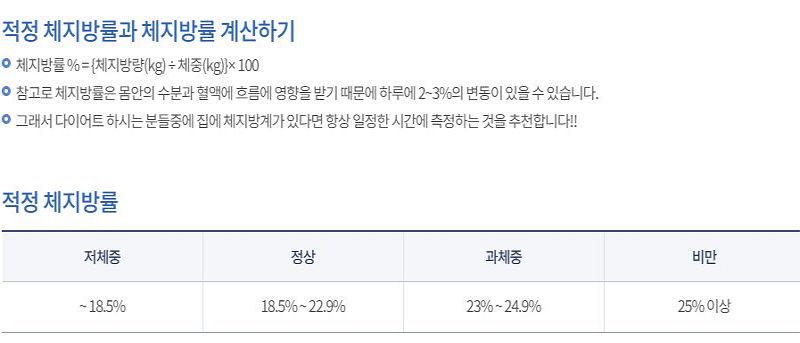 – 체지방률 : 체중에서 체지방량이 차지하는 비율