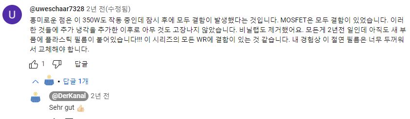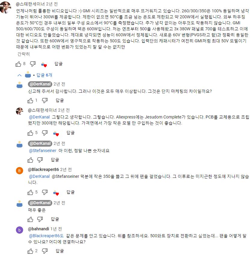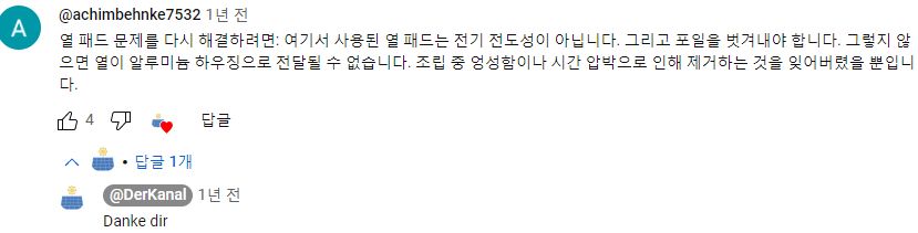 저 영상은 독일어로 진행됩니다. 일단 샀으면 뜯어보고 점검하시라는 것. 조립할 때 열전도패드를 붙이면서 보호비닐을 안 떼서 패드가 제 역할을 못해 아주 뜨겁다는 이야기. 부품 자체도 주장하는 규격에 못 미치는 것 같다는 말, 3가지 케이스 크기로 팔리고 각 케이스 크기는 또 각각 3가지씩의 용량구별이 있지만 각 케이스 크기 안에서는 부품이 똑같은 거 아니냐는 질문 등.