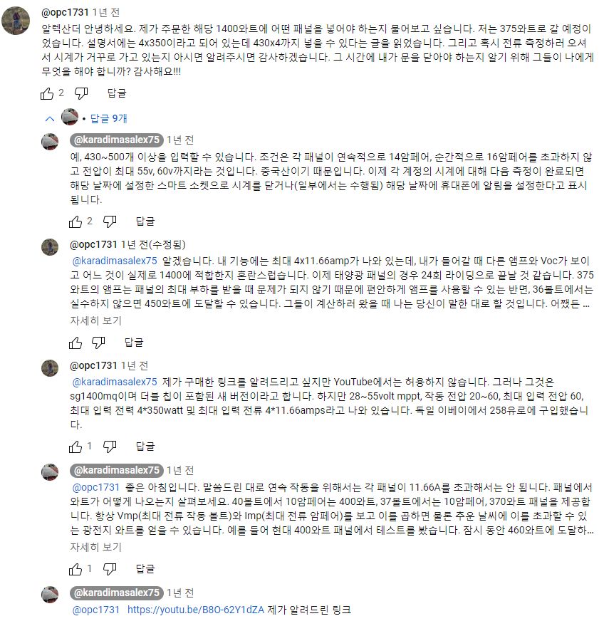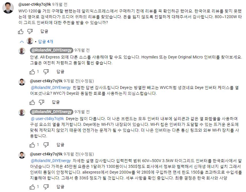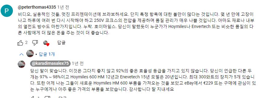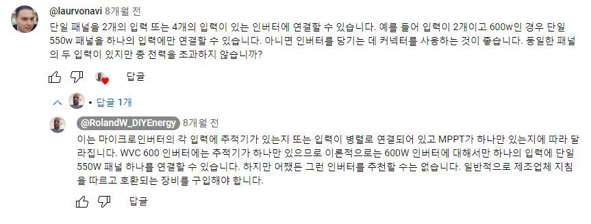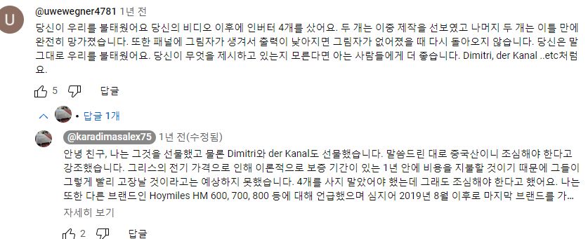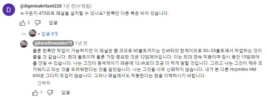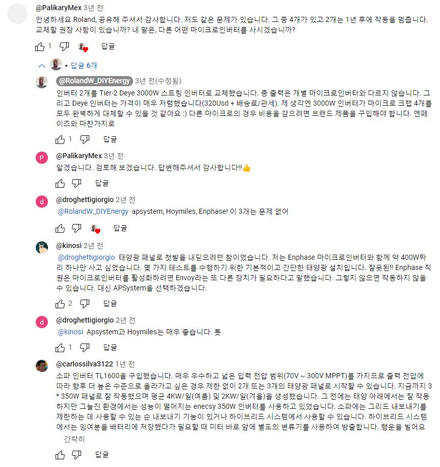 그래서, 외국 유튜버들은 할 수만 있으면, 어차피 삼십만원넘게 주고 로컬에서 구할 게 아니라 직구로 값싼 중국산을 살 거라면 아예 3kW짜리 주택태양광용 큰 인버터를 사는 게 품질도 낫고 교체주기가 길어서 손해가 아니라는 말하는 사람도 있었다. 다만 아파트에선 그건 무리고 잘해아 하이브리드 인버터 정도? 그것도 설치문제가 있지만.4
