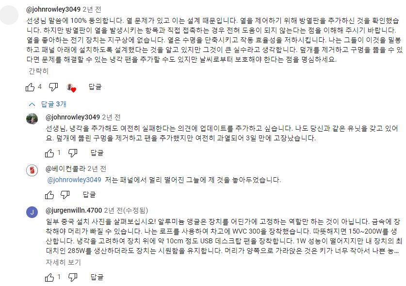 댓글이나 다른 영상에, 거의 모든 이 가격대 중국산 마이크로인버터는 발열이슈가 있어 방열대책을 세워야 하며 부품이 좋지 못하다고 하더라. 수명도 짧을 뿐더러, 처음 연결해서 측정해보면 동작하는 걸 알 수 있는 경우라도, 과열시 자동 기능정지(안전장치)1가 너무 자주 발동하기 때문에 정작 해가 짱짱할 때는 제대로 발전을 못한다고. 심지어 어떤 마이크로인버터는 열어보니 열전도패드가 포장비닐이 붙은 채로 조립돼있어서 방열이 더 안 됐다고.