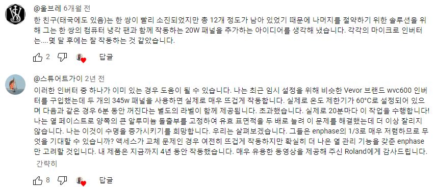 그래서 이미 샀으면 어쩔 수 없이 마이크로인버터마다 쿨링팬을 붙이고 그 팬마다 구동용으로 12볼트 패널을 붙이거나 인버터 AC출력에서 선을 따서 어댑터를 붙인다는 튜닝기가 있어 웃펐다.