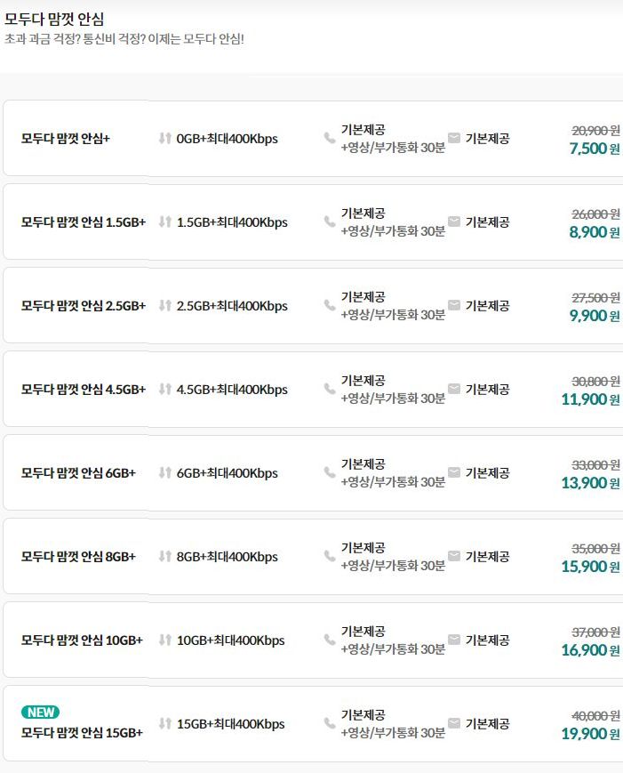 QoS가 있는 요금젣제들. 400kbps QoS는 1만원 아래에도 있고, 1Mbps QoS는 1만원대 요금제..