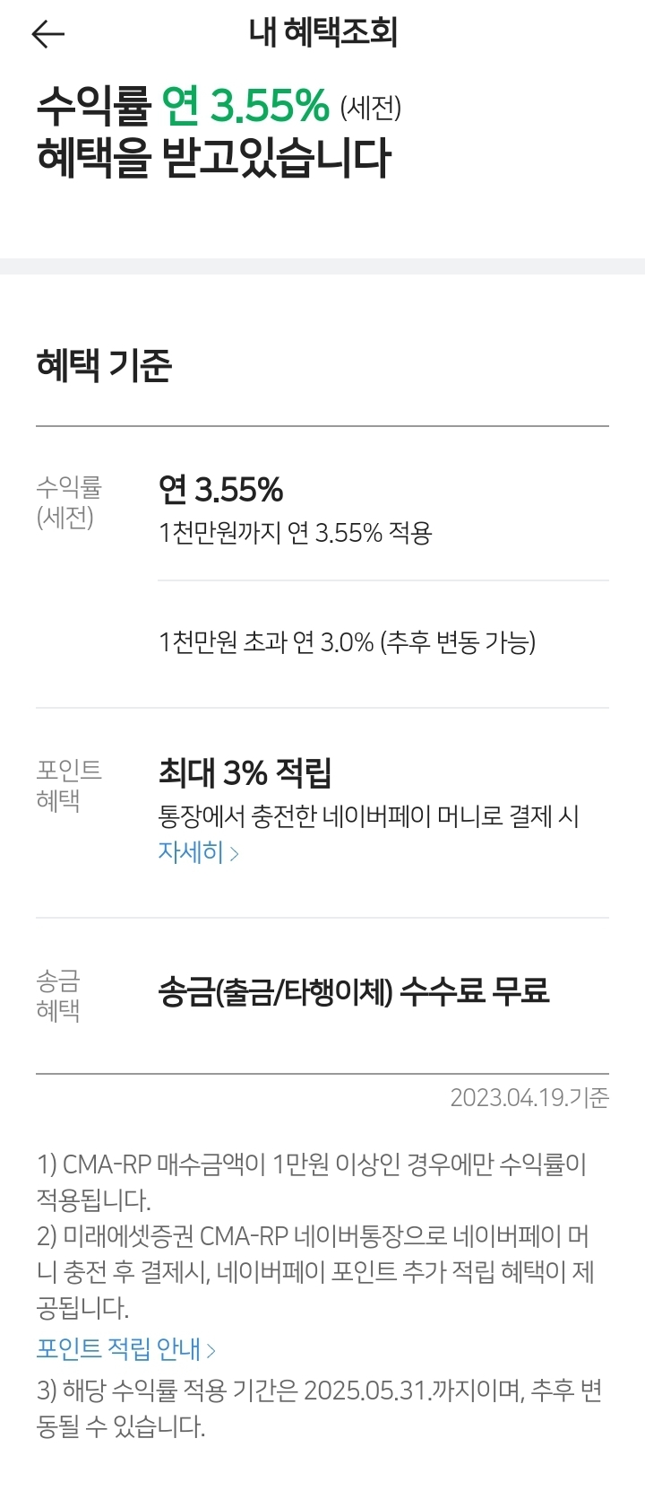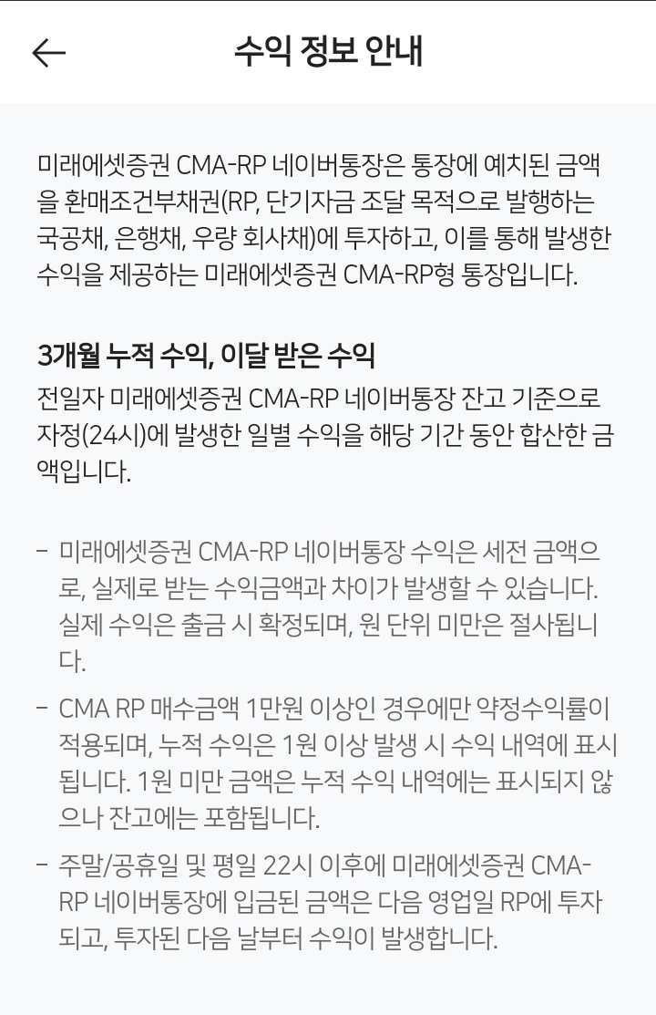 미래에셋증권 CMA-RP 네이버통장 (2024. 6. 14. 기준) 본문
