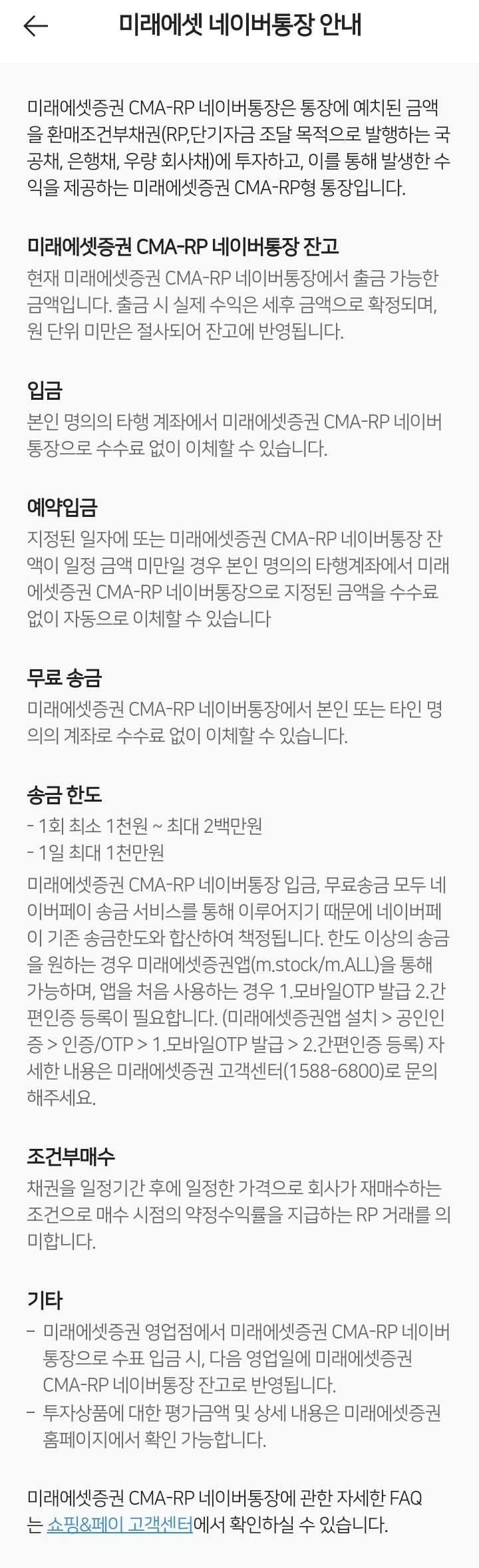미래에셋증권 CMA-RP 네이버통장 FAQ