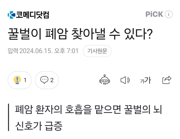 "폐암 환자의 합성 호흡 혼합물과 건강한 사람의 합성 호흡 혼합물을 명확하게 구별하는 꿀벌의 뇌에서 여러 가지 뉴런이 발화하는 것을 발견했다"(......) "앞으로 환자가 장치를 통해 숨을 쉬기만 하면 되는 비침습적 테스트를 개발할 계획"(......) - 코메디닷컴