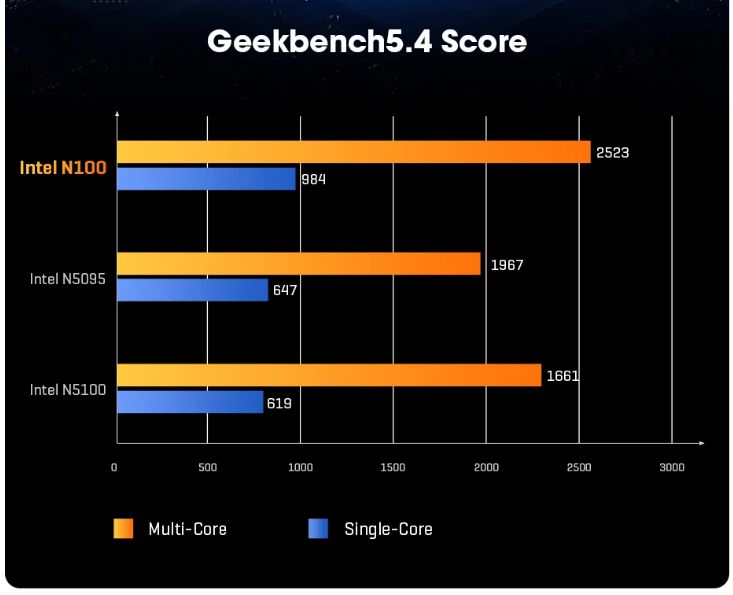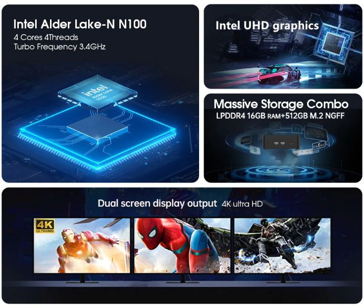 인텔 N100은 요즘 이런 데 넣어 파는 것 중에 괜찮은 것내지 단가가 싸서 중국업체들이 즐겨 쓴다고 한다. 원래 저전력 저발열 저성능 모바일용으로 나온 것을 미니 PC에 박았다.
