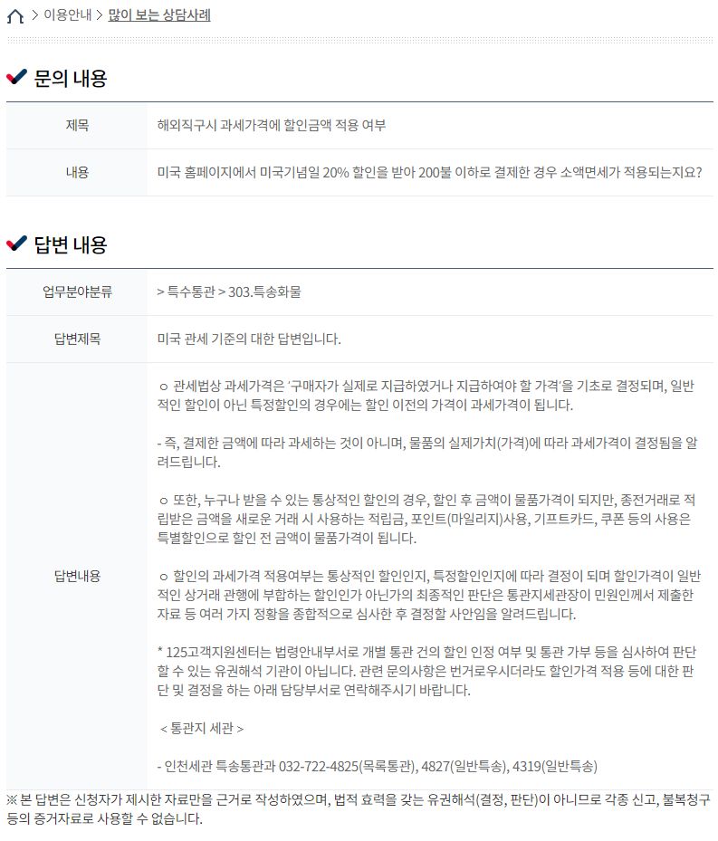 해외직구시 과세가격에 할인금액 적용 여부