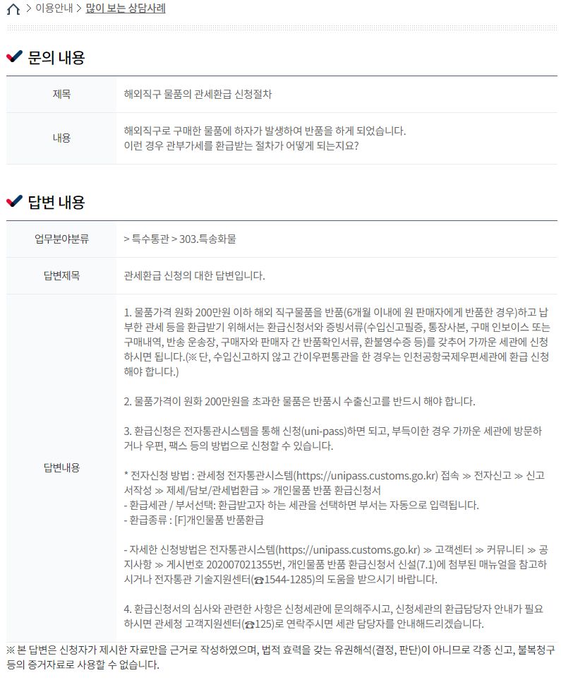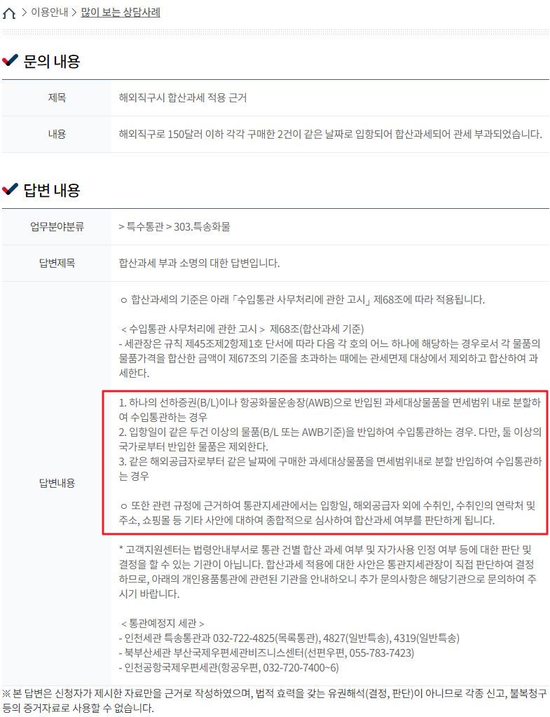 관세청 고객지원센터, 많이 보는 상담사례(FAQ): 해외직구 합산과세기준, 간이통관방법 등 본문
