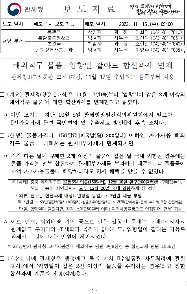 ㅇ 또한 관련 규정에 근거하여 통관지세관에서는 입항일, 해외공급자 외에 수취인, 수취인의 연락처 및 주소, 쇼핑몰 등 기타 사안에 대하여 종합적으로 심사하여 합산과세 여부를 판단하게 됩니다.