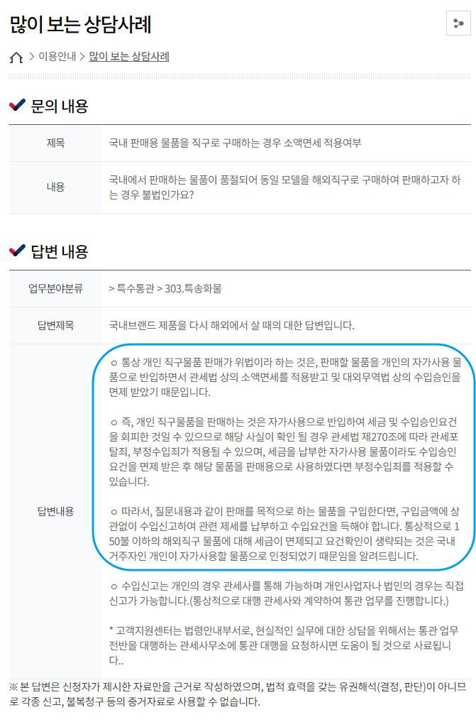 관세청> 많이 보는 상담사례> 국내 판매용 물품을 직구로 구매하는 경우 소액면세 적용여부
