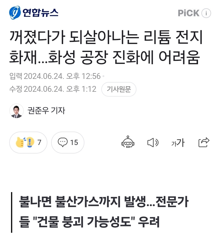 꺼졌다가 되살아나는 리튬 전지 화재…화성 공장 진화에 어려움