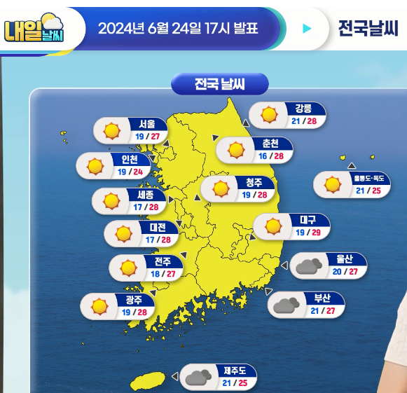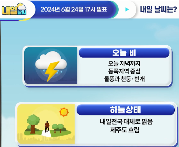 [내일날씨] 오늘 저녁까지 동쪽지역 중심으로 요란한 비 오는 곳 있어요~ 6월 24일 17시 기준